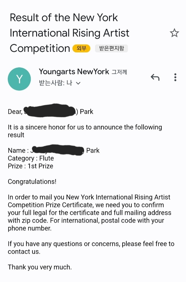 New York International Rising Artist Competition 뉴욕라이징국제콩쿨 고등부 플루트1등