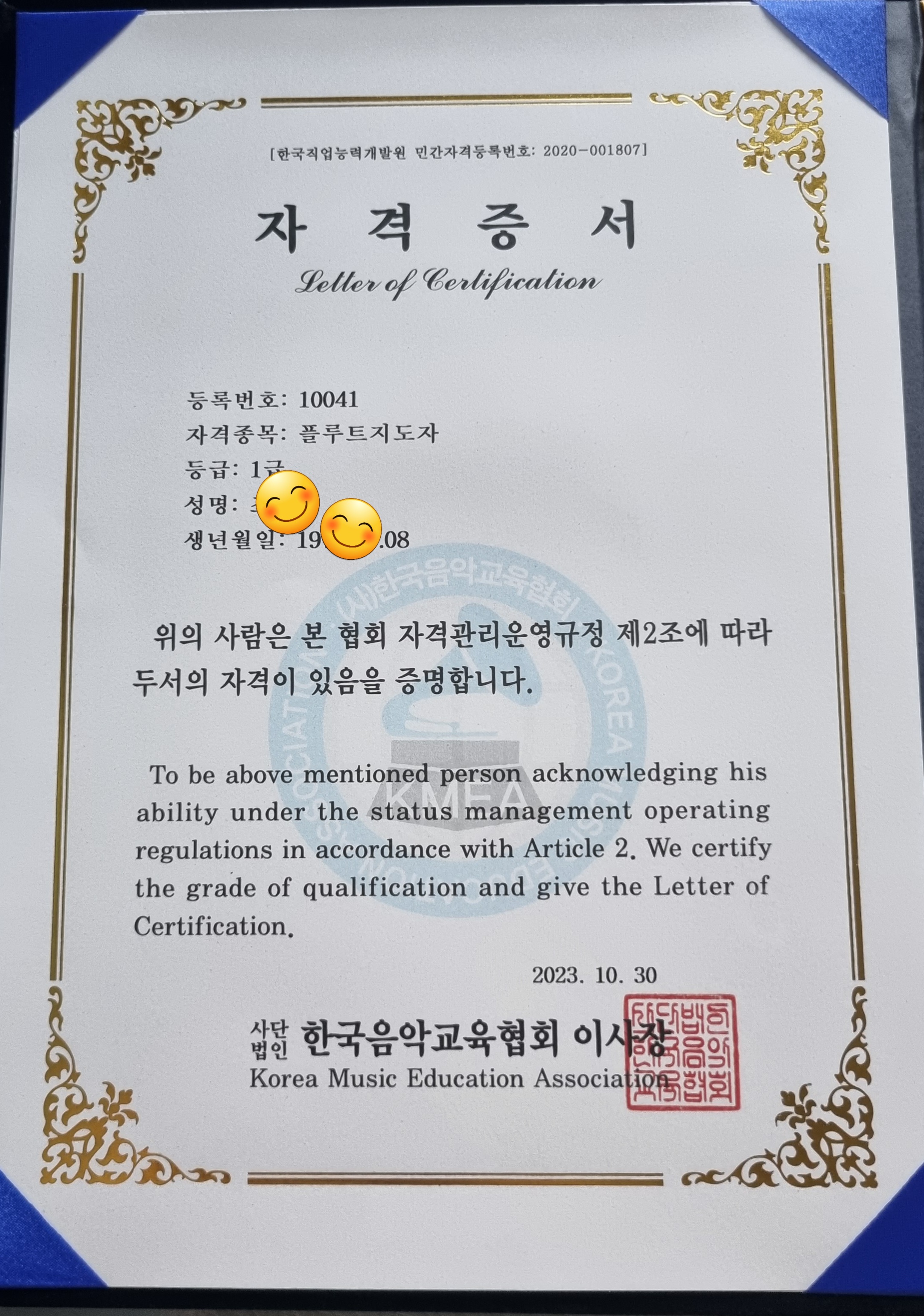 교육부인가플루트지도자자격증 ㅡ70대 수강생분취득