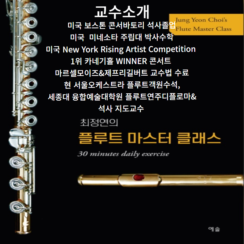 강의켜리큘럼: 한학기 15주 20년학생티칭경력의 플루트교본의저자직강으로실전레슨현장과 콩쿨,오케오디션고득점합격포인트레슨으로 이루어진 강의이다.초중고오케시험곡&학원발표회&수행평가악보제공